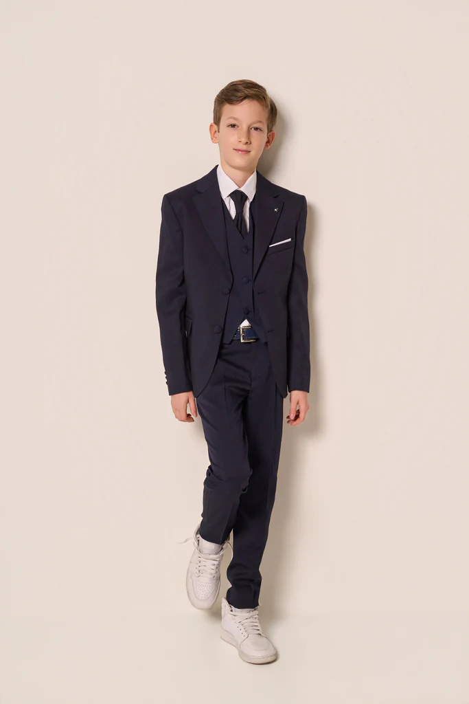 Descrizione:Abito bambino dal taglio sartoriale, elegante e raffinato, perfetto per cerimonie, eventi speciali e occasioni importanti. Realizzato in un intenso blu navy, si distingue per la linea moderna e la cura dei dettagli.Il completo รจ composto da giacca monopetto con rever classico, taschino con pochette a contrasto e chiusura con bottoni coordinati. Il gilet abbinato dona struttura e un tocco ancora piรน formale al look, mentre il pantalone slim fit completa lโinsieme con una vestibilitร pulita e contemporanea.Camicia bianca e cravatta tono su tono valorizzano lโeleganza dellโabito, creando un outfit sofisticato ma attuale. Un completo pensato per far sentire ogni bambino impeccabile, con stile e personalitร .