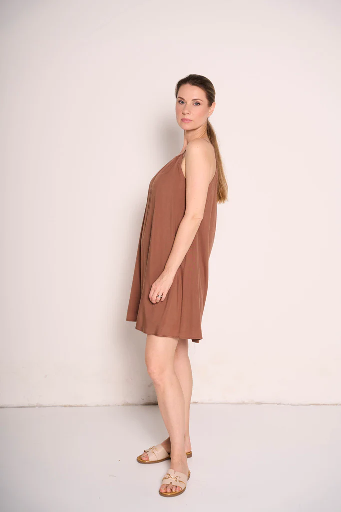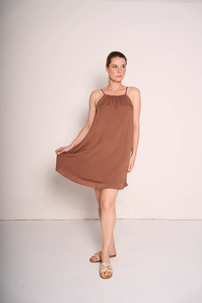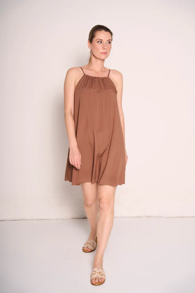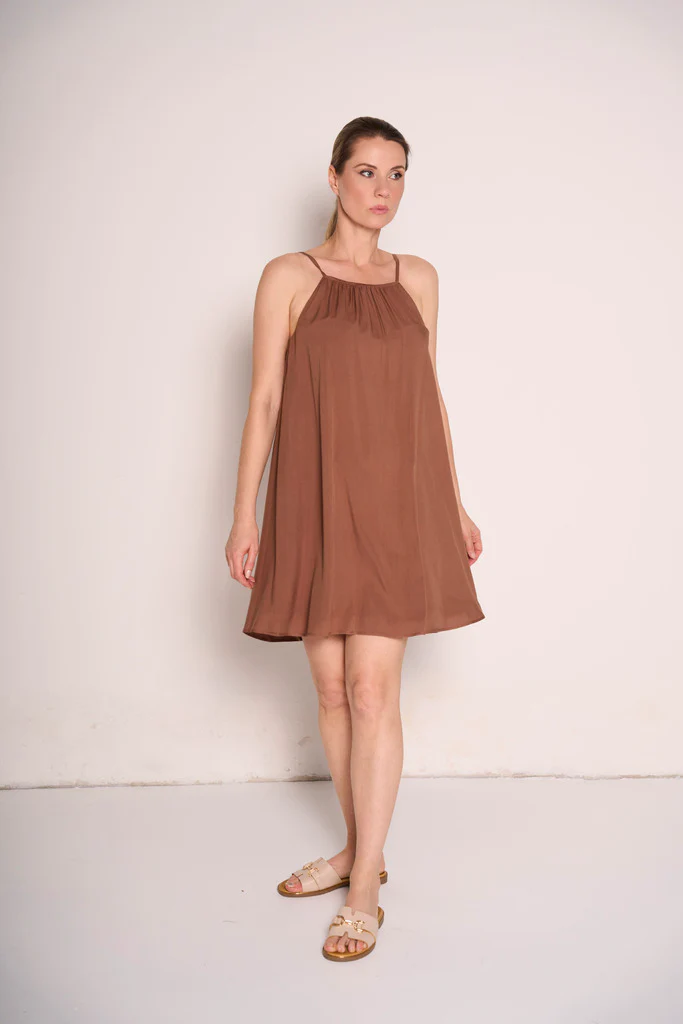 Leggerezza e semplicitร  si fondono in questo abito estivo cioccolato, ideale per affrontare le giornate piรน calde con stile. Il design con spalline sottili e scollo arricciato dona un tocco delicato e femminile, mentre la linea morbida e la lunghezza sopra il ginocchio garantiscono comfort e libertร  di movimento. Perfetto per un look casual chic, da completare con sandali intrecciati e accessori naturali.