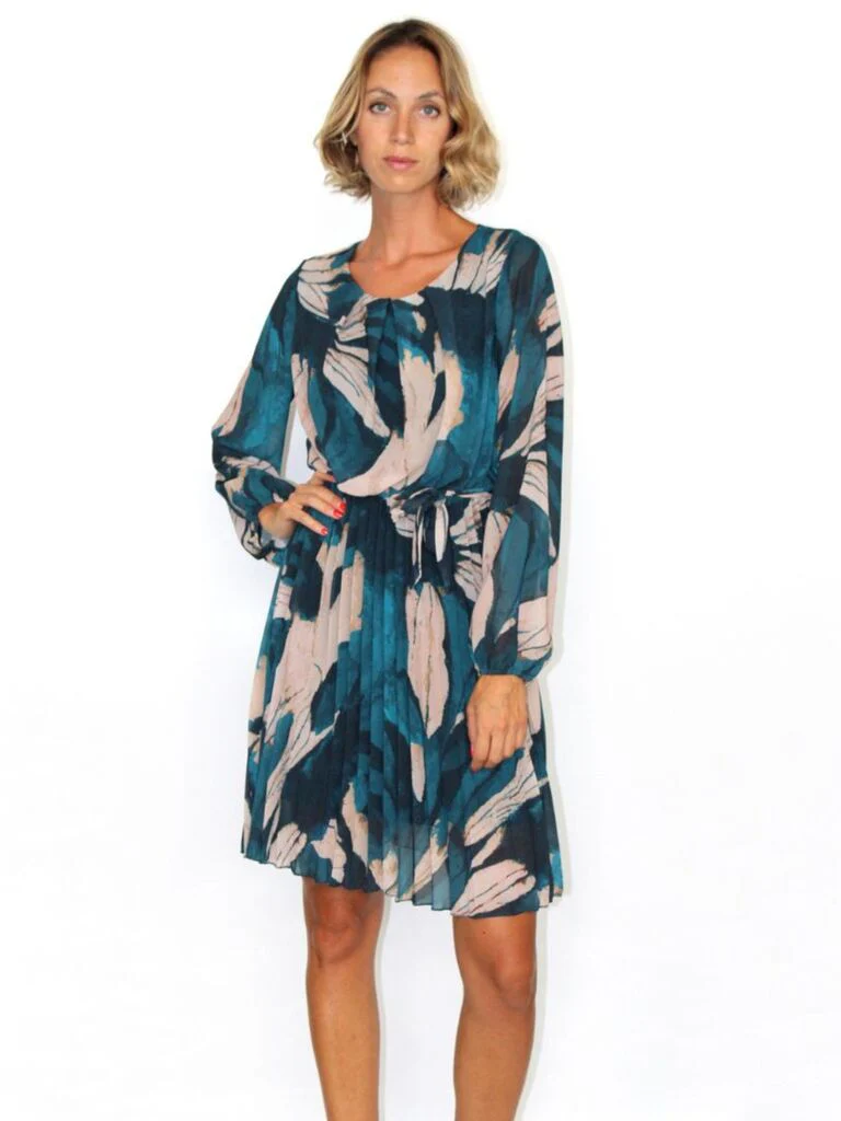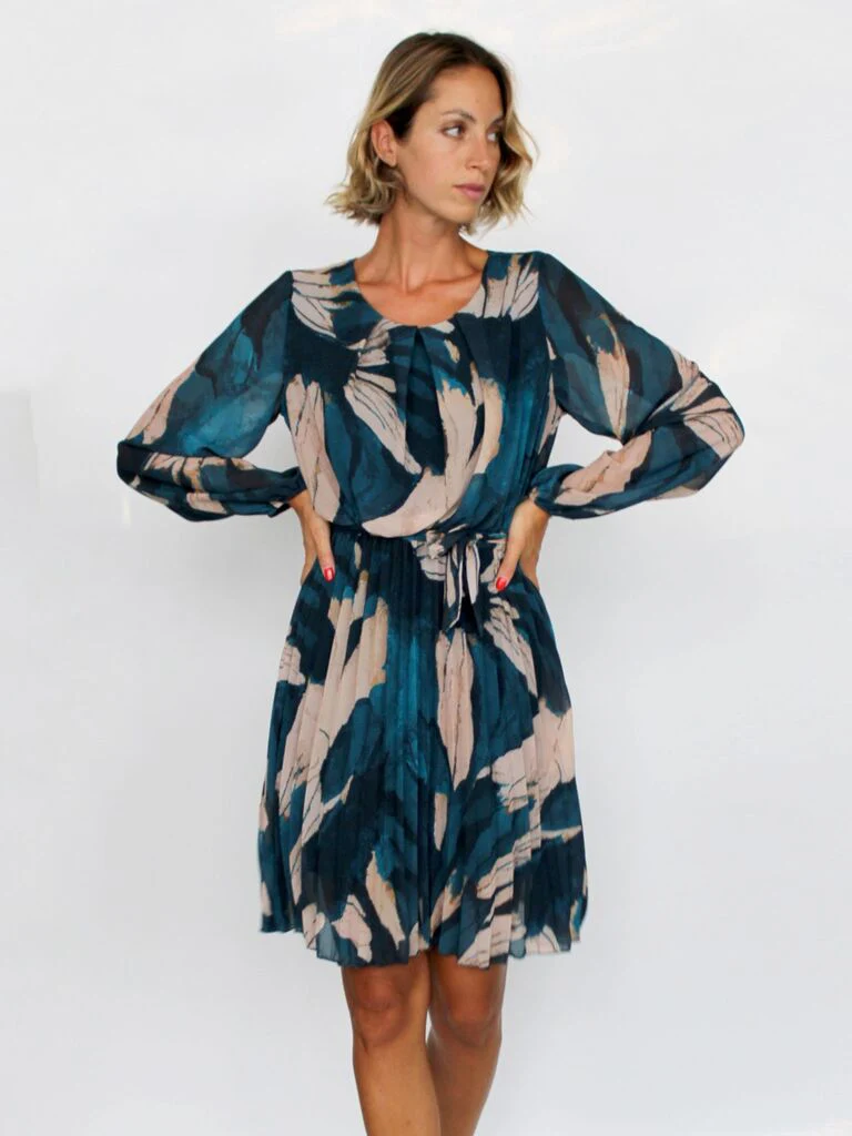 Abito corto girocollo con piega, gonna plissettata con cinturina di tessuto in vita