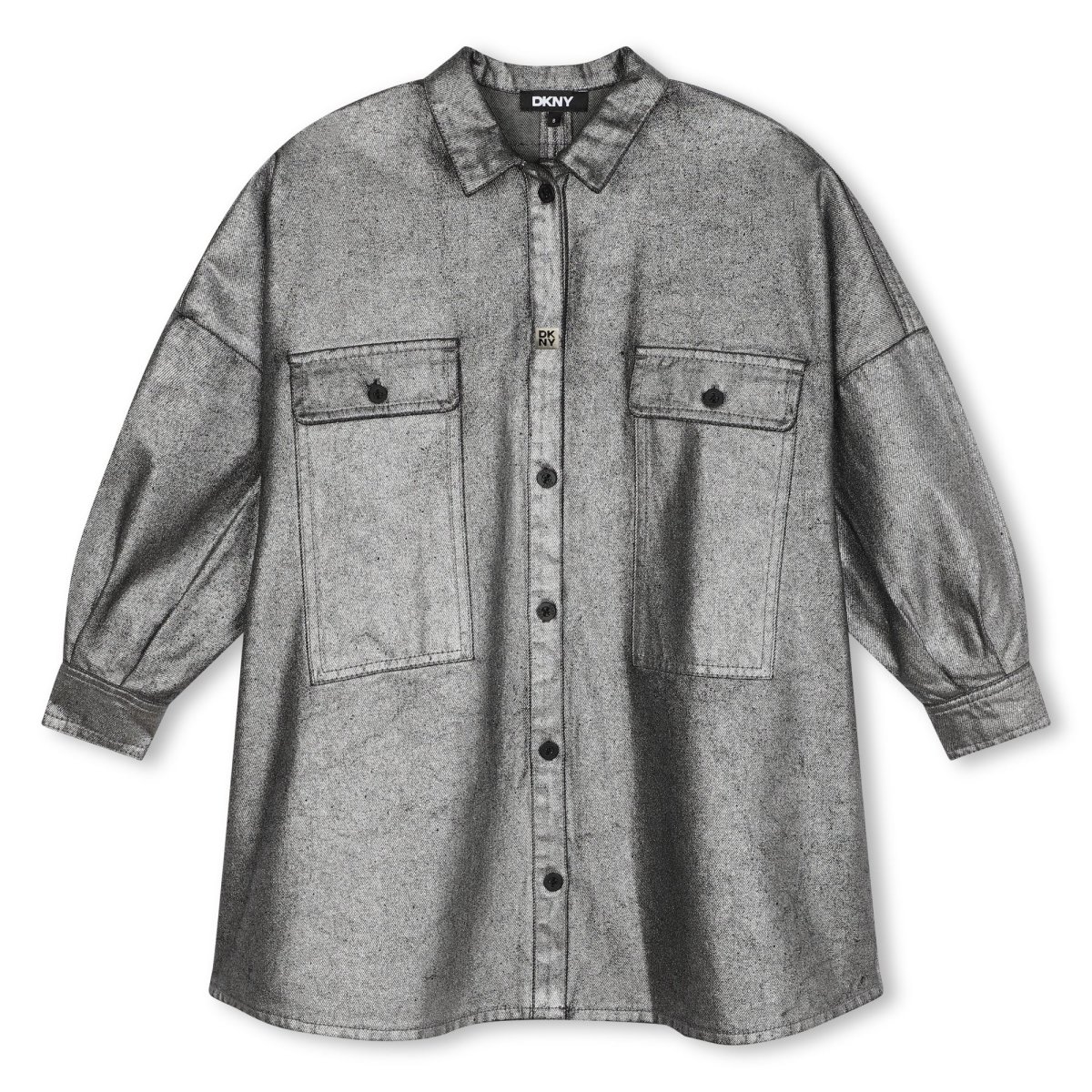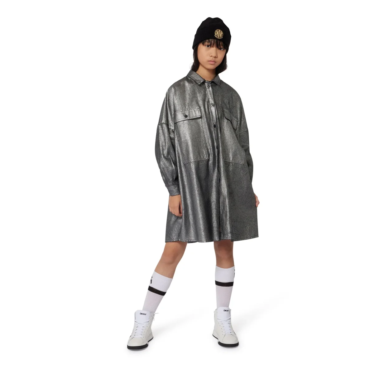 Questo vestito in jeans DKNY รจ caratterizzato da un taglio a camicia e da un originalissimo colore metallizzato. Dotato di un’apertura con bottoni e ampie tasche applicate sul davanti, questo modello รจ realizzato in puro cotone.