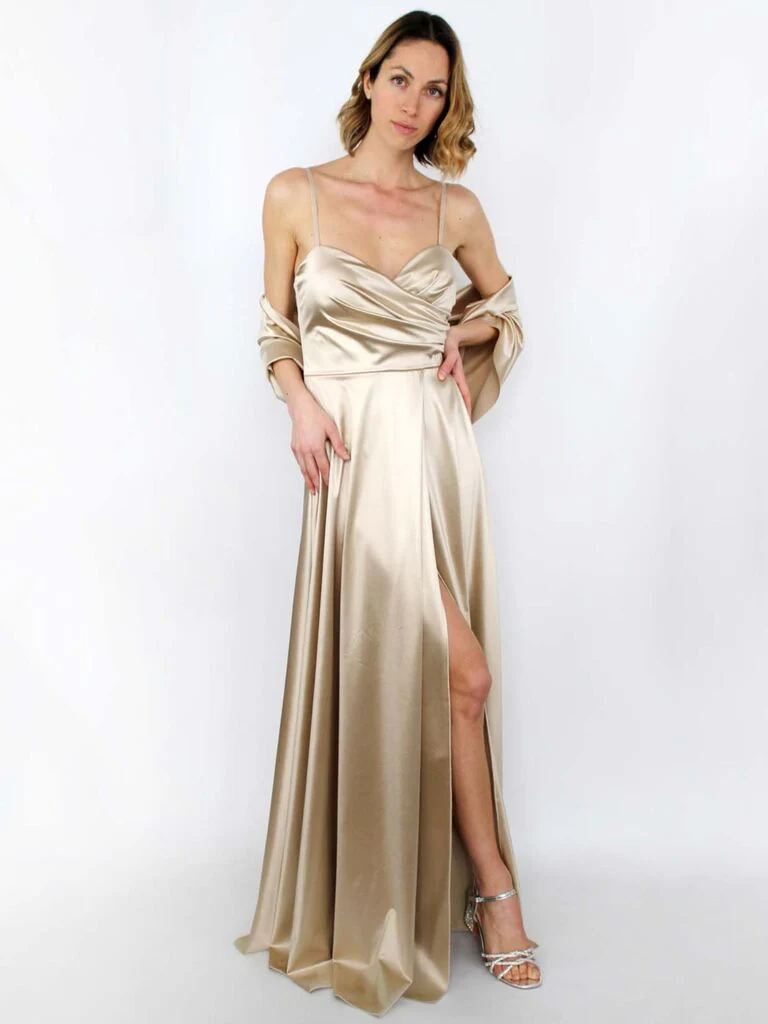 Abito in raso con spacco e spalline, con stola.