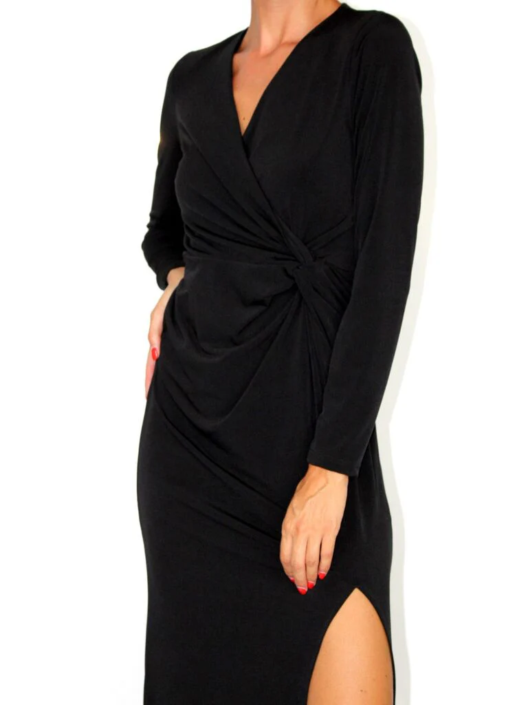 Abito lungo con scollo a V. Spacco e nodo laterale