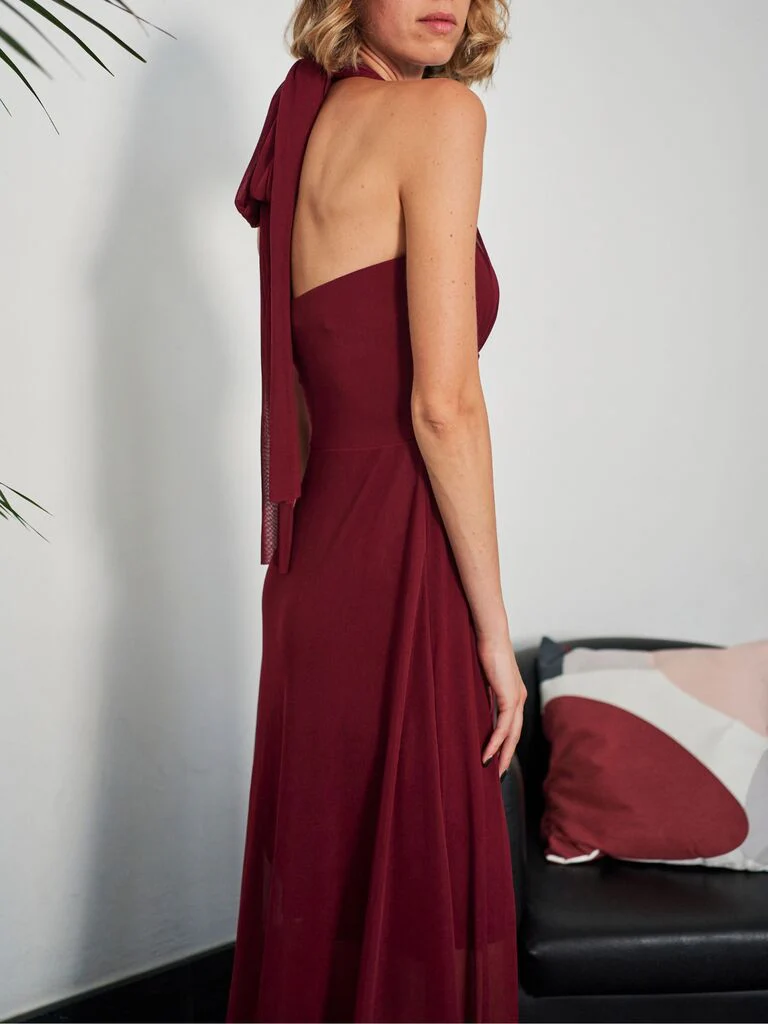Vestito con scollo a fascia e fasce da legare dietro il collo. Gonna lunga con spacco e sottoveste.