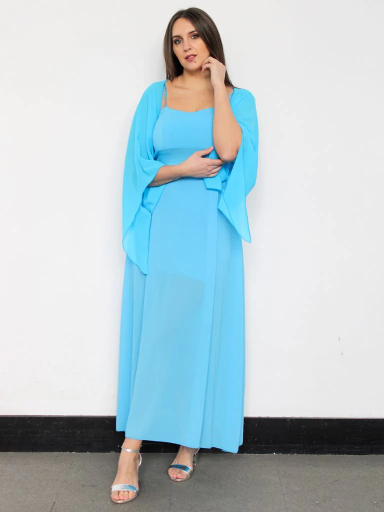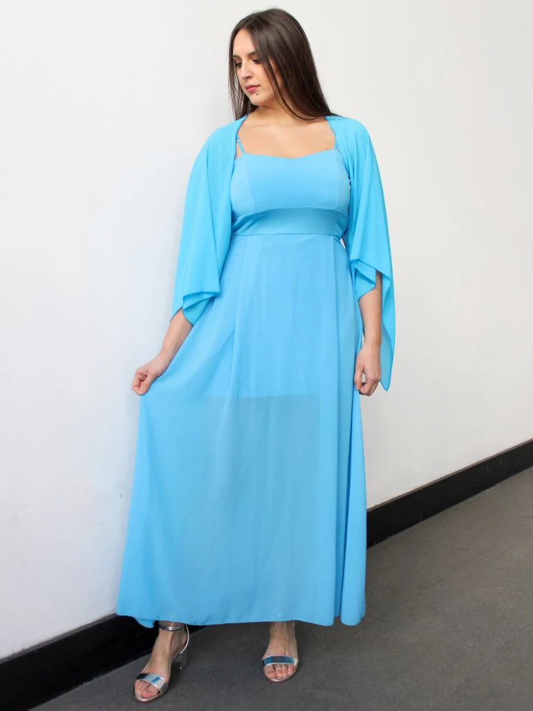 Abito lungo a bustino con coppette e fasciato in vita. Gonna lunga semitrasparente con sottogonna in viscosa. Spalline sottili regolabili