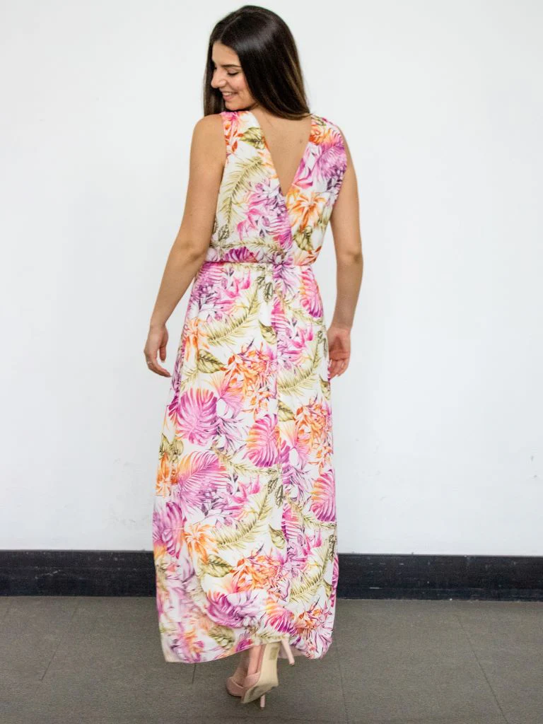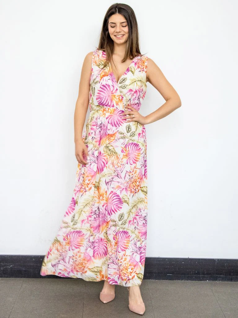 Abito lungo in fantasia floreale. Scollo a v incrociato anteriore e posteriore con elastico in vita