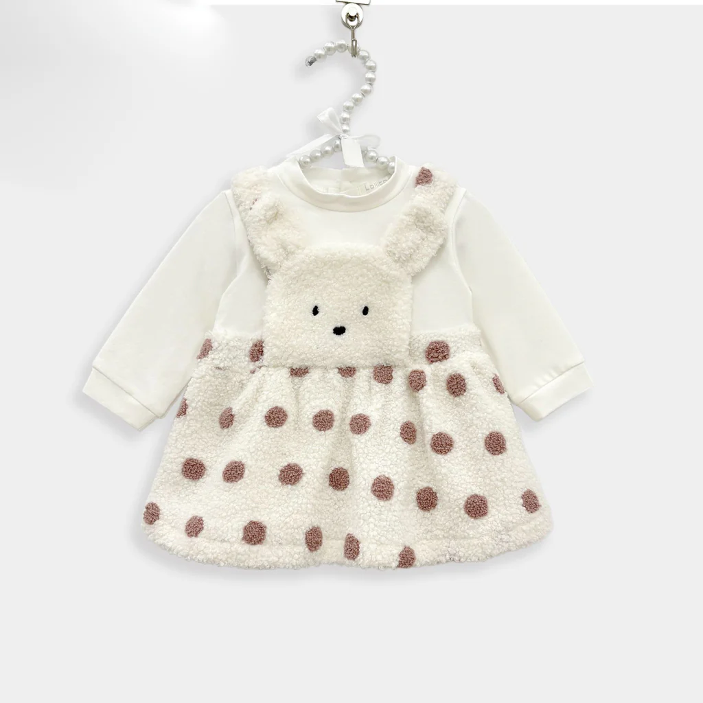 Abitino con effetto salopette in morbido tessuto teddy. Presenta maniche lunghe, gonna a balza a pois e pettorina impreziosita da un tenero inserto a forma di orsetto con orecchiette applicate. Caldo e confortevole, รจ perfetto per la stagione piรน fresca.