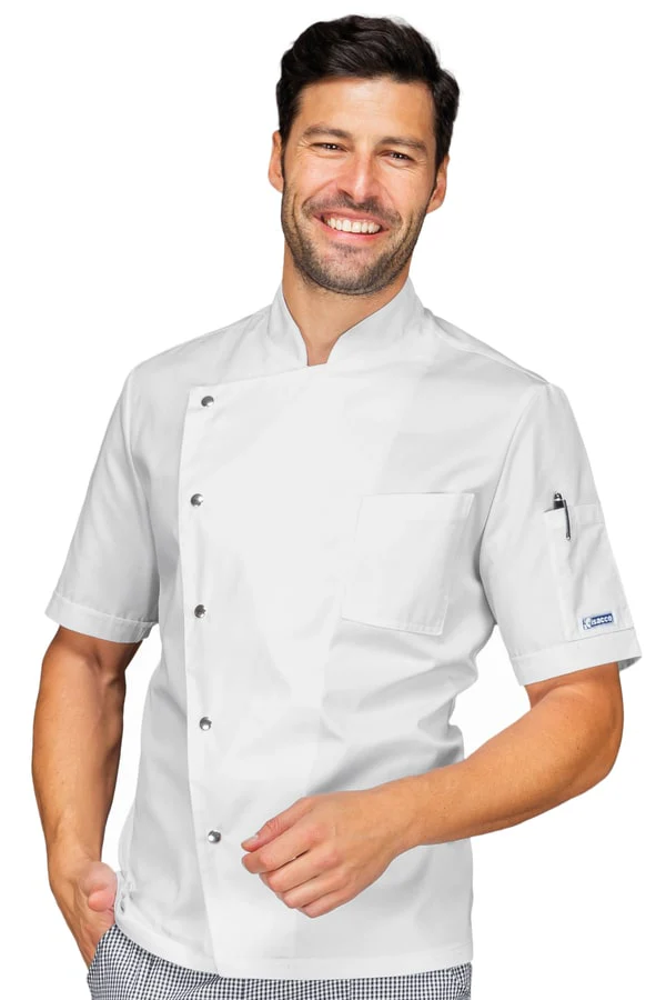 Giacca da cuoco moderna con vestibilitร slim ed apertura laterale con bottoni a pressione metallici. Collo simmetrico alla coreana. Leggera e traspirante si contraddistingue per il taglio moderno con apertura diagonale a lato. Dotata di due ampie fasce microforate poste sui fianchi.