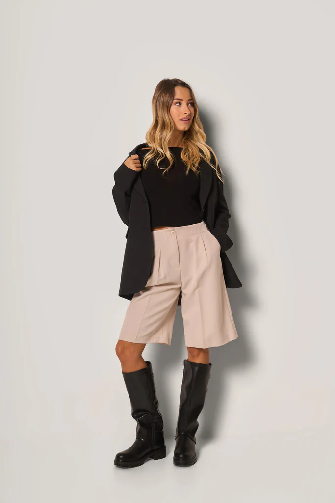 Bermuda eleganti realizzati in tessuto fluido con vita alta e pinces frontali che valorizzano la silhouette. Il design dโispirazione tailoring e la lunghezza al ginocchio donano unโeleganza disinvolta e contemporanea.