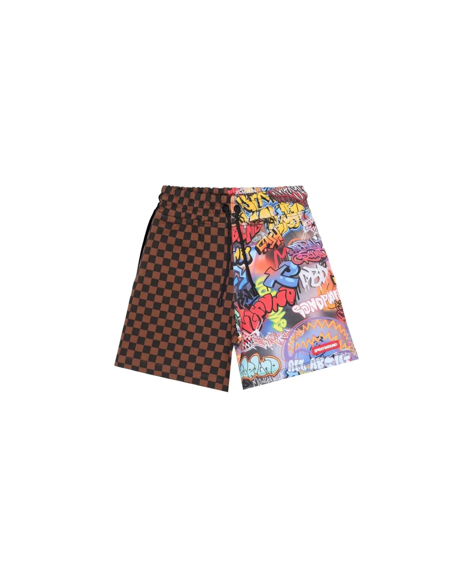 BERMUDA SPRAYGROUND A SCACCHI MARRONE CON STAMPA UFO