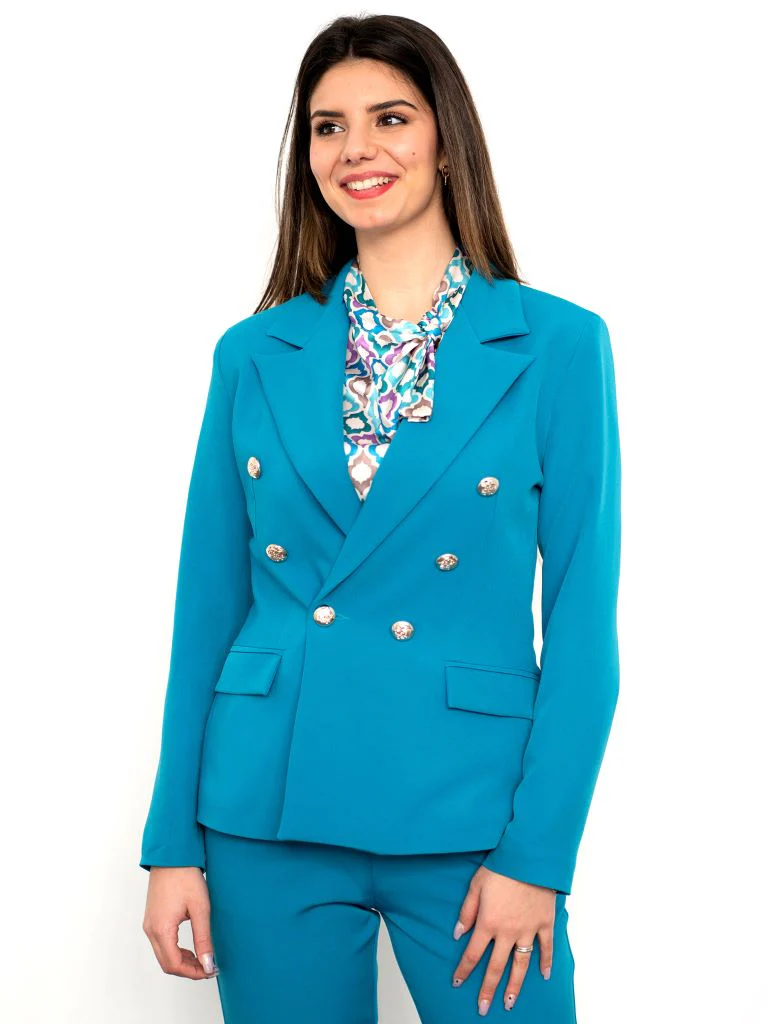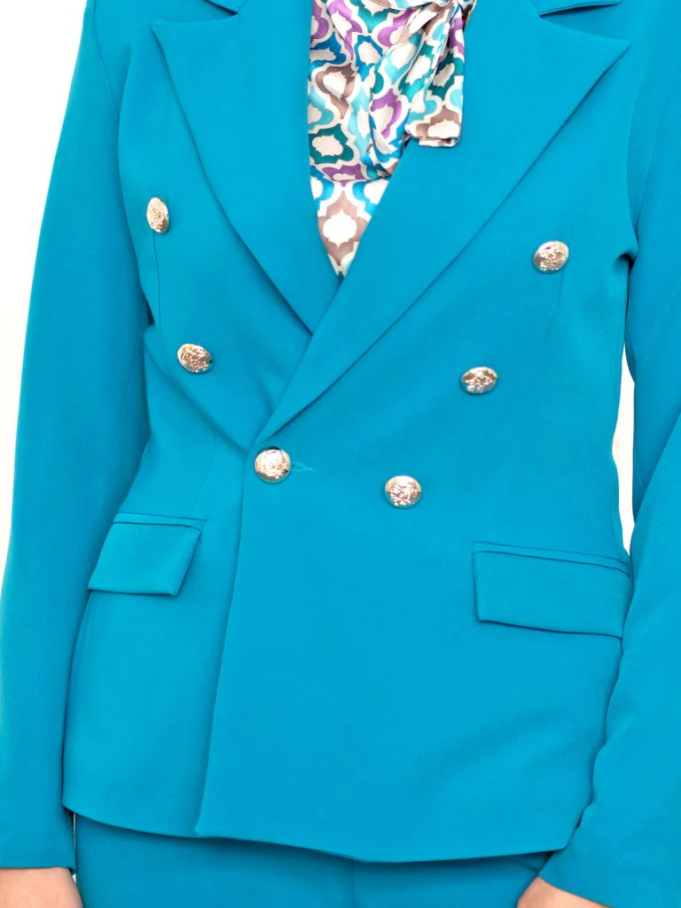 DESCRIZIONEBlazer doppiopetto strutturato con spalline in spugna. Ampie reverse, chiusura un bottone. Finte tasche con pattaComposizione: 98% poliestere, 11% elastanCodice prodotto: 243485