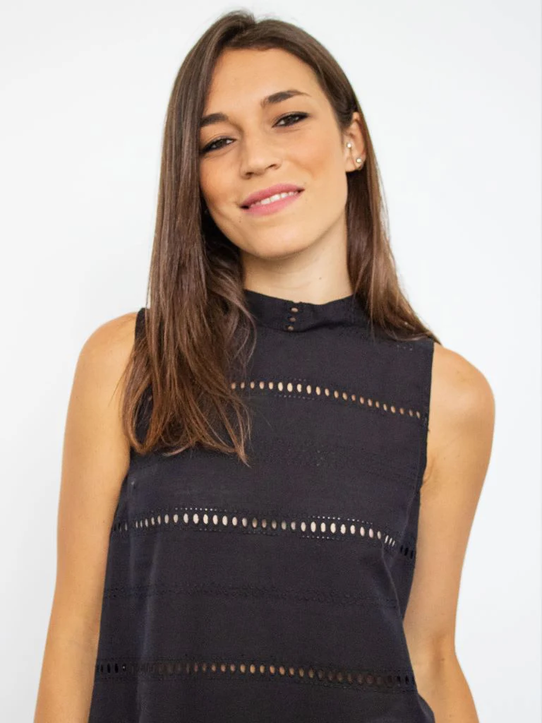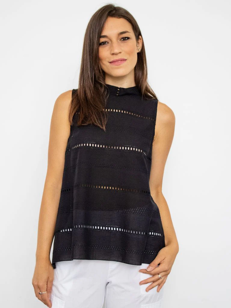 DESCRIZIONEBlusa in tessuto di cotone smanicata. Dettaglio traforato. Asimmetrica piรน lunga nella parte posteriore con fiocco e pincesComposizione: 100% cotone