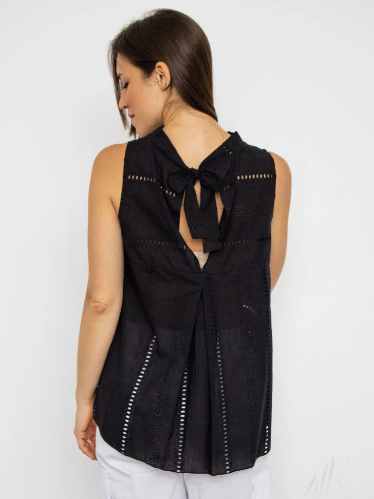Blusa in tessuto di cotone smanicata. Dettaglio traforato. Asimmetrica piรน lunga nella parte posteriore con fiocco e pinces