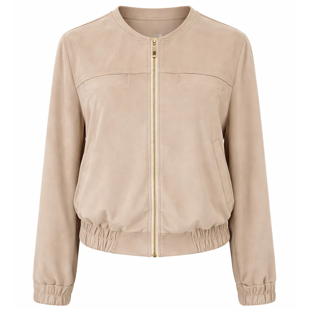 Bomber donna dal design essenziale e contemporaneo, realizzato in morbido tessuto effetto suede dal finish vellutato. La linea รจ leggermente cropped con fondo elasticizzato che valorizza la silhouette, mentre la chiusura frontale con zip dorata aggiunge un tocco luminoso e raffinato. Completano il modello le tasche laterali e i polsini elasticizzati per un fit confortevole e versatile. Perfetta da abbinare sia a look casual che piรน eleganti per uno stile moderno e femminile.