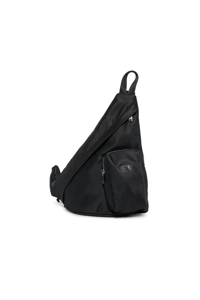 Borsa a tracolla giapponese. Caratterizzata da una silhouette triangolare. Tasca frontale con logo numerico in tono. Tracolla regolabile. Chiusura frontale nascosta con zip. Cucitura iconica sul retro. Una reinterpretazione dell’accessorio piรน emblematico di MM6, tratto dalla collezione per adulti. Misure: altezza 36 cm, larghezza 8 cm, lunghezza 31 cm. Altezza manico: 8 cm. Lunghezza tracolla: 68 cm.