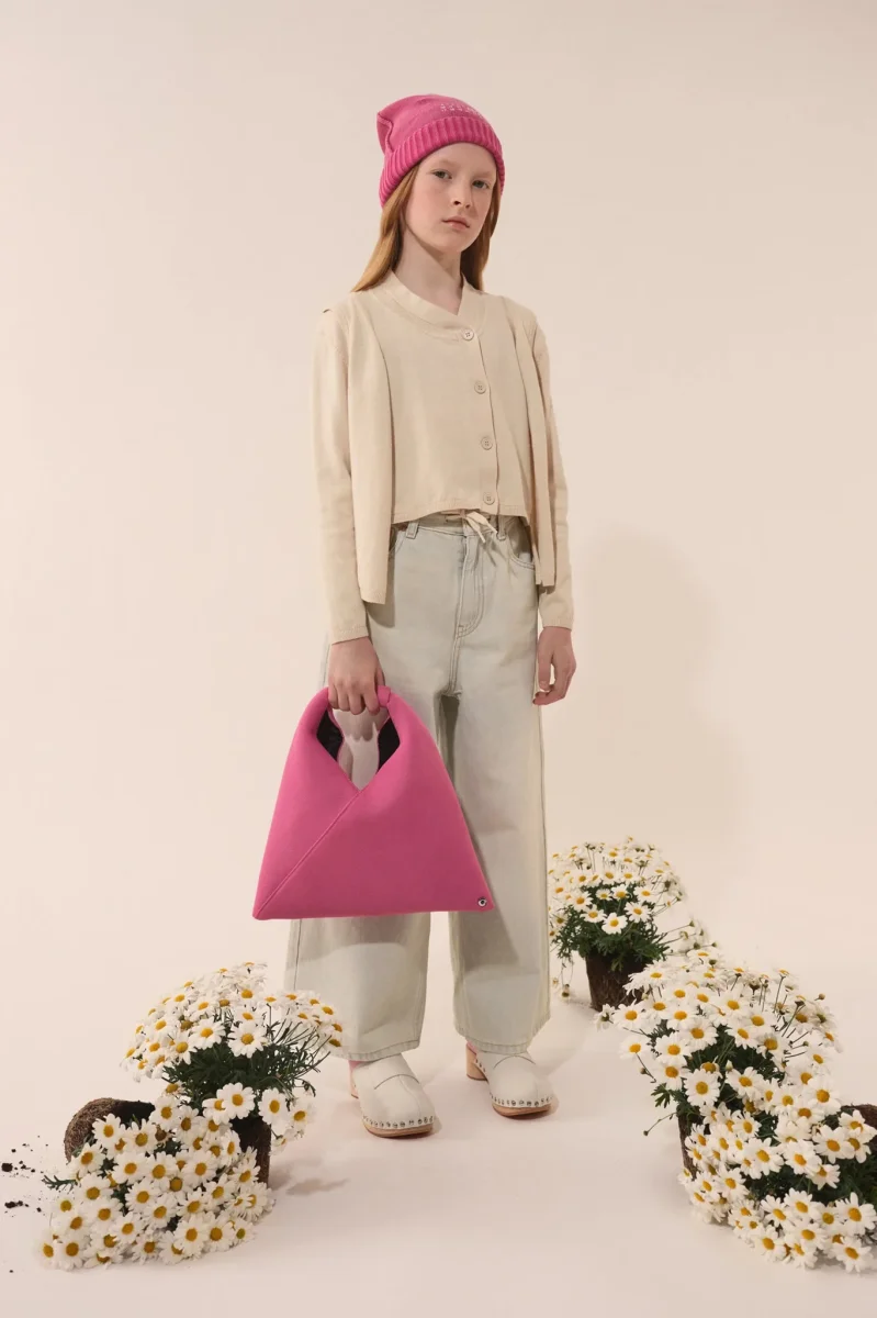 Borsa Japanese Bag in mesh Mini. Caratterizzata da una silhouette triangolare e dalla presenza di bottoni ai bordi che consentono di cambiare forma alla borsa piegandola in modi diversi, un chiaro richiamo al codice estetico della Maison francese. Il manico presenta una parte in pelle con logo numerico. ร lโaccessorio piรน emblematico di MM6, ripreso dalla collezione adulto.