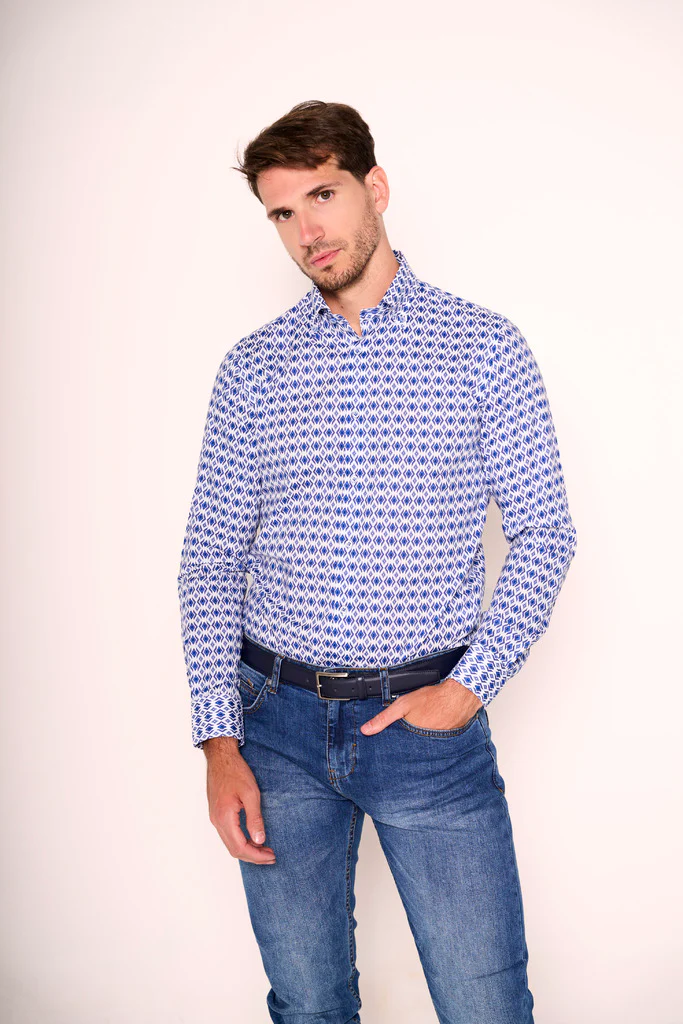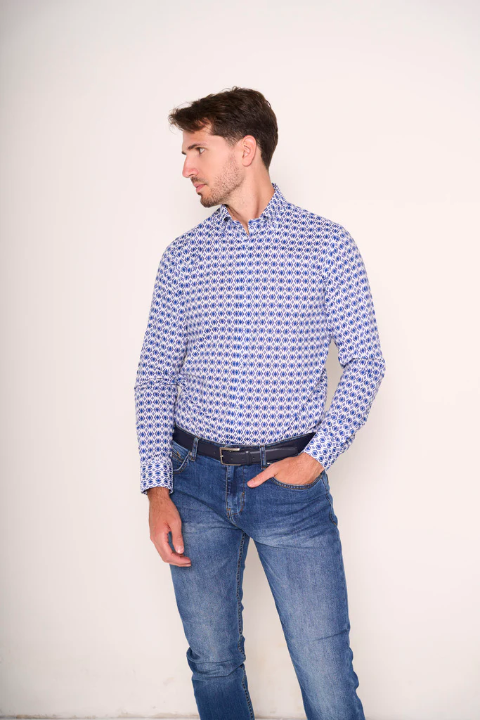 Questa camicia รจ la scelta perfetta per chi vuole distinguersi con stile. La fantasia geometrica nei toni del blu e dell’azzurro dona un tocco moderno e audace, ideale per aggiornare qualsiasi guardaroba. Il taglio classico la rende versatile, perfetta sotto una giacca o indossata da sola, dentro o fuori dai pantaloni. Ottima per look casual chic, ma anche per occasioni piรน formali con un twist creativo.