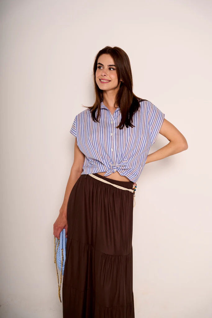 Un mix di freschezza e carattere in un unico capo. Questa camicia a righe bianche, blu e marrone, con maniche corte e chiusura a bottoni, si distingue per il suo nodo frontale che aggiunge un tocco dinamico e femminile. Il tessuto leggero e il taglio morbido la rendono ideale per look casual ma curati, perfetta da abbinare con jeans, gonne o pantaloni a vita alta per un outfit estivo sempre attuale.