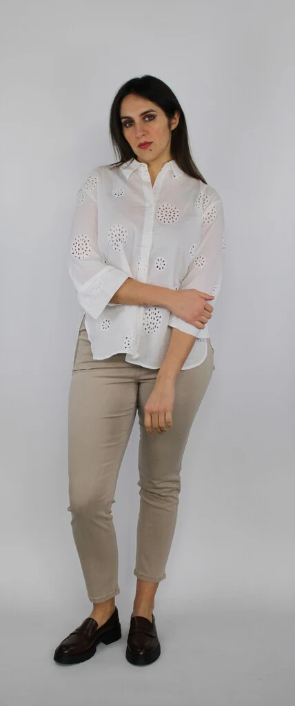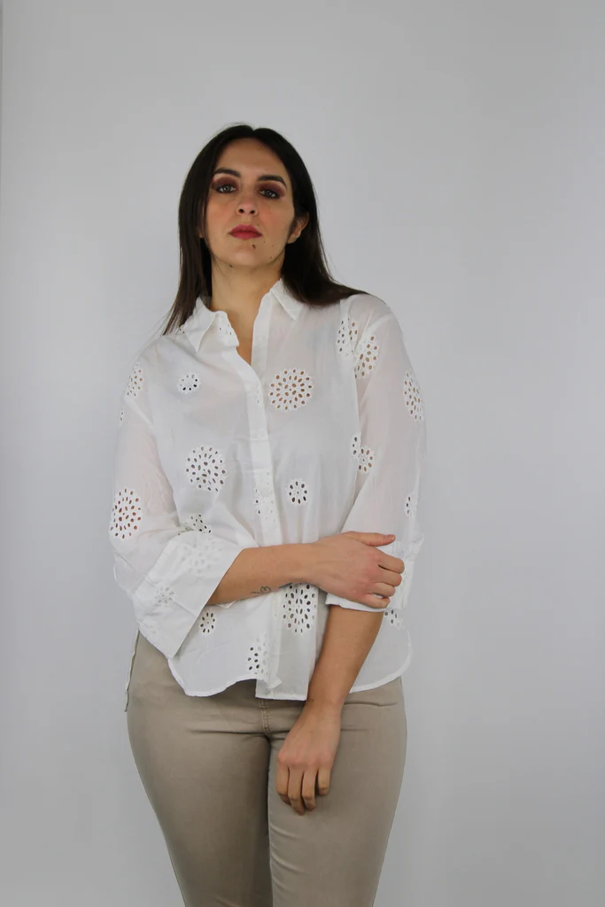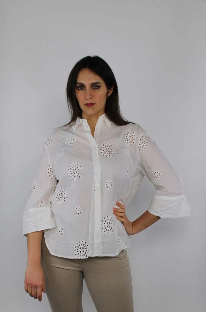 Camicia leggera in puro cotone bianco con lavorazione traforata a motivi circolari. Manica a 3/4, taglio dritto e collo classico per uno stile fresco e femminile, perfetta per la primavera e lโestate. Ideale con jeans o pantaloni beige per un look casual chic.Composizione: 100% cotone