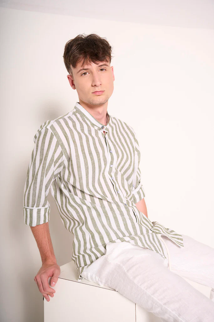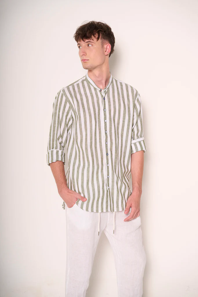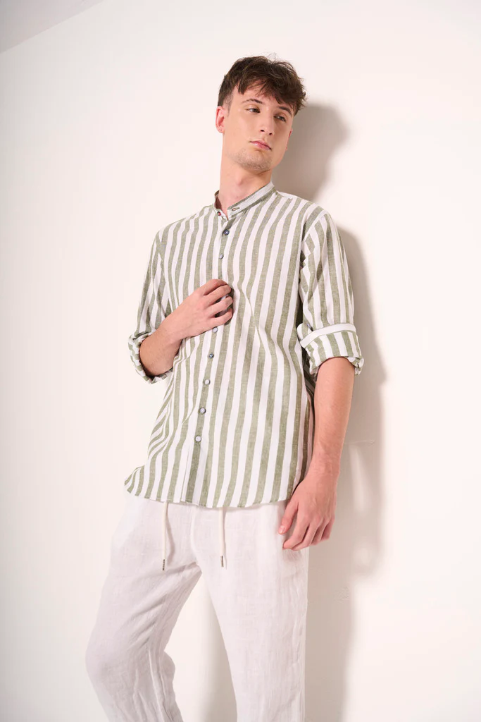 Questa camicia a righe verdi e bianche, in puro lino, รจ la scelta ideale per un look fresco e raffinato. Il taglio regolare, unito al colletto alla coreana, dona un tocco contemporaneo e disinvolto. Leggera e traspirante, รจ perfetta per le giornate calde e si abbina facilmente sia a pantaloni eleganti che ad outfit piรน casual. Stile autentico e naturale in ogni dettaglio.