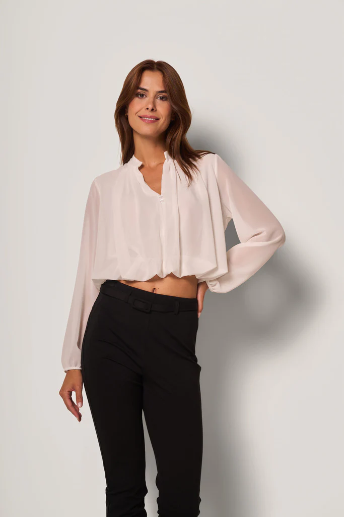 Camicia corta effetto georgette semitrasparente. Il modello presenta colletto arricciato, maniche lunghe ampie con polsino, e chiusura frontale con bottoncino. Il fondo elasticizzato crea un delicato effetto blusante che valorizza la silhouette.