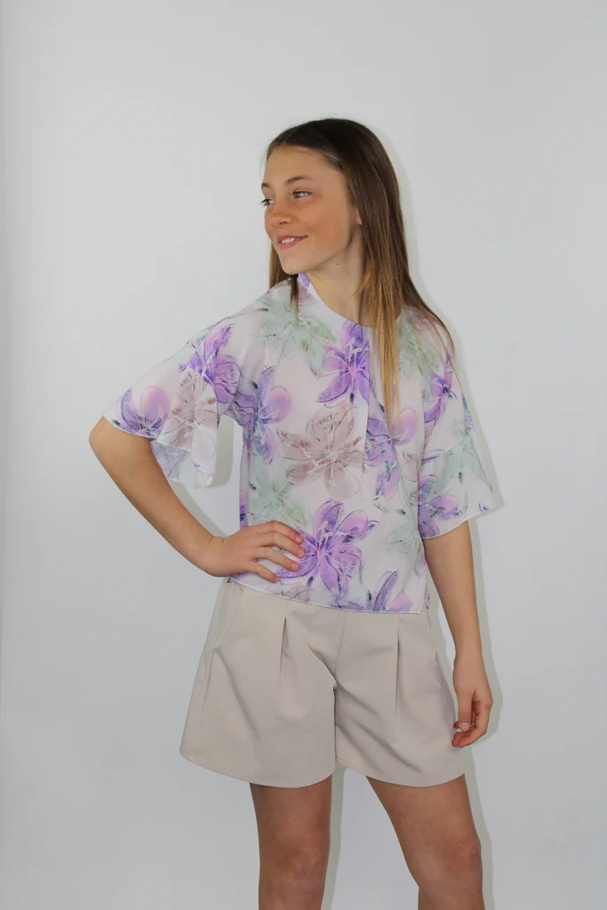 Camicia da bambina in fantasia lilla con fiori, maniche 3/4 larghe.