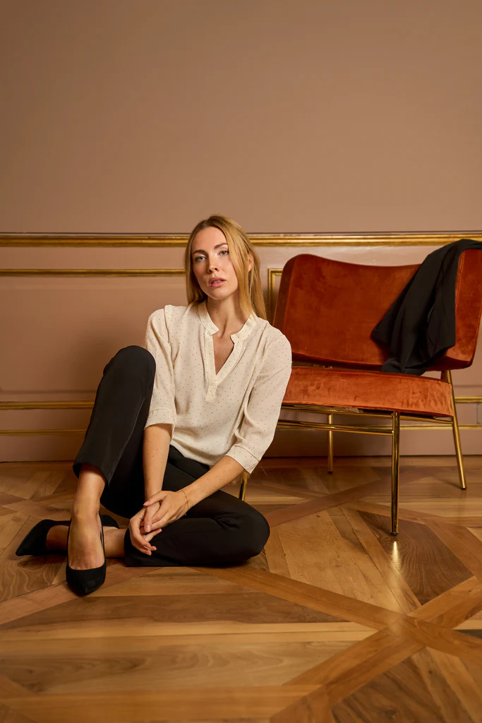 Camicia in georgette mezza manica, con collo alla coreana, scollo a V e spacchetti.