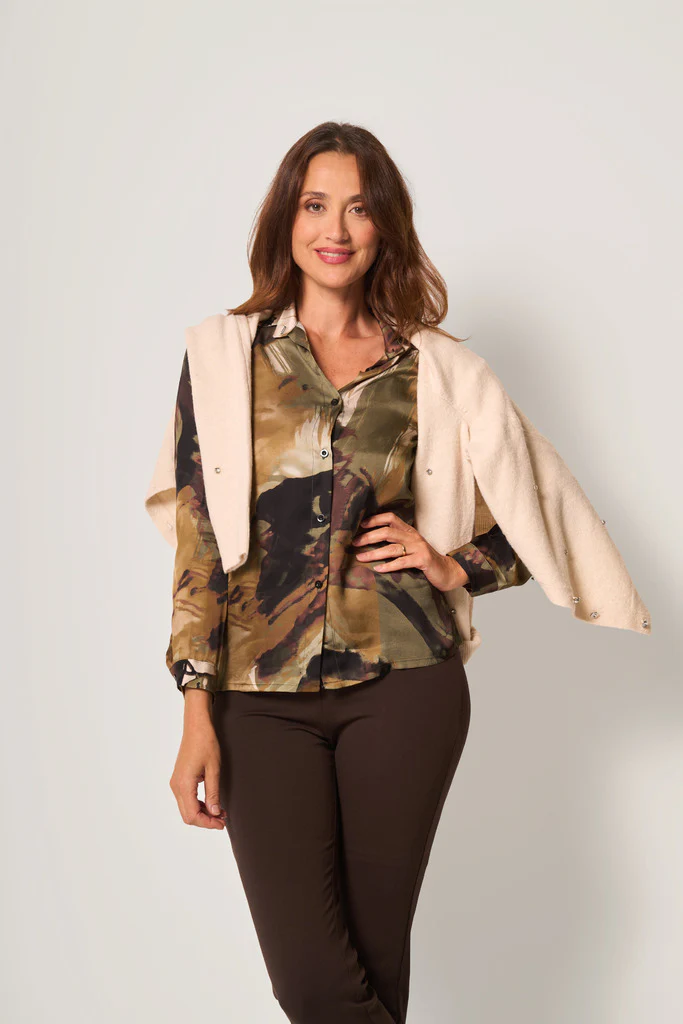 Camicia dalla linea morbida, caratterizzata da una stampa artistica multicolor nei toni del verde, marrone e beige. Il modello presenta colletto classico, chiusura frontale con bottoni e maniche lunghe con polsino abbottonato.