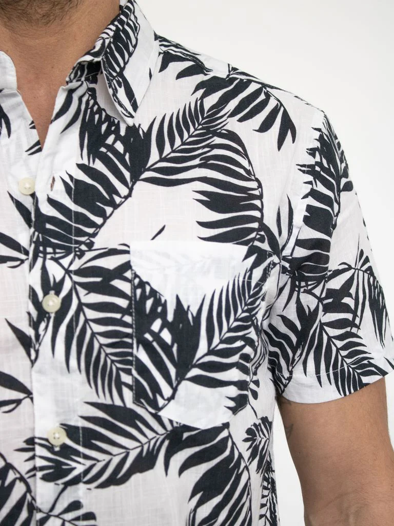 Camicia a mezza manica con colletto. Stampa foliage e taschino applicato frontale