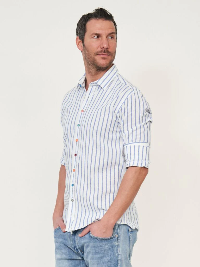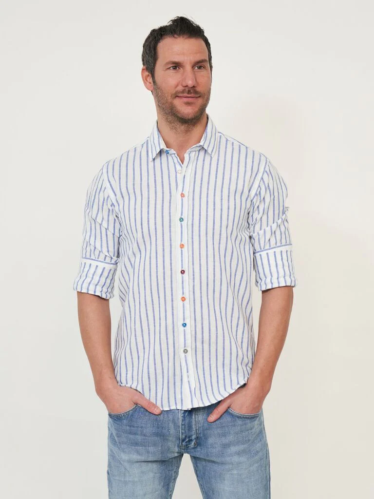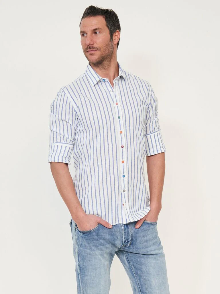 DESCRIZIONECamicia con bottoni multicolorComposizione: 55% lino, 45% cotoneCodice prodotto: 250235