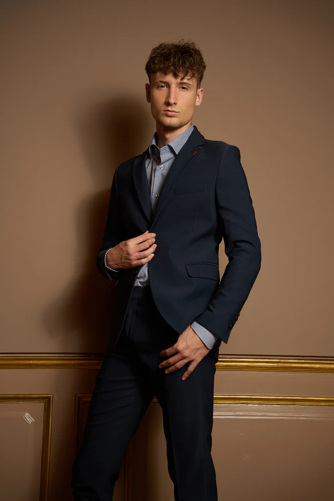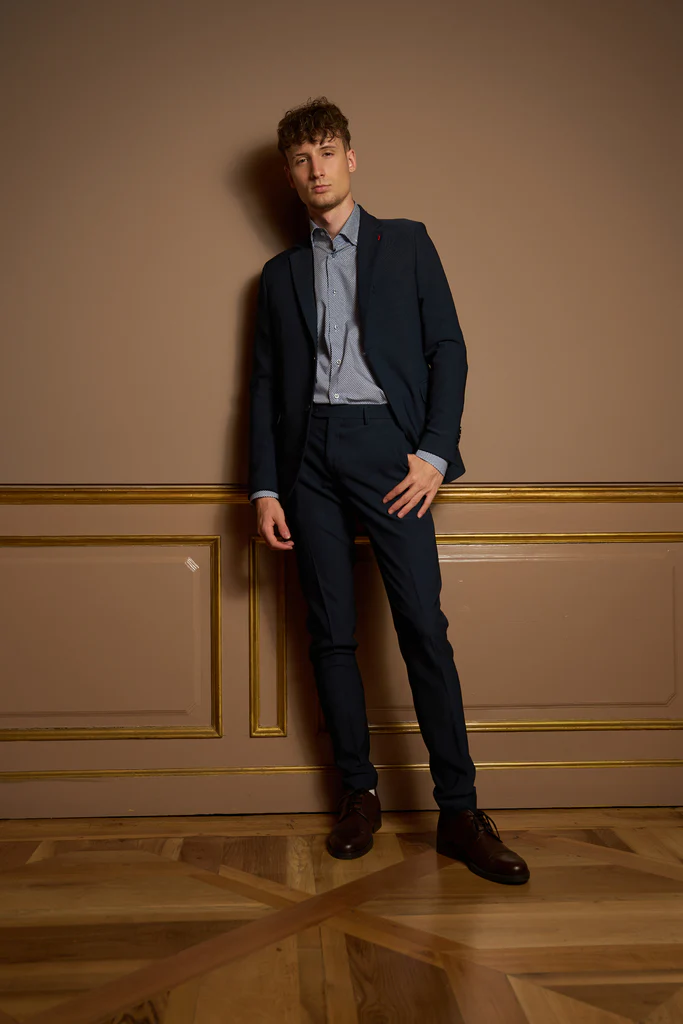 Camicia a maniche lunghe in cotone, caratterizzata da una raffinata microfantasia geometrica su base chiara, con colletto classico e chiusura con bottoni tono su tono.
