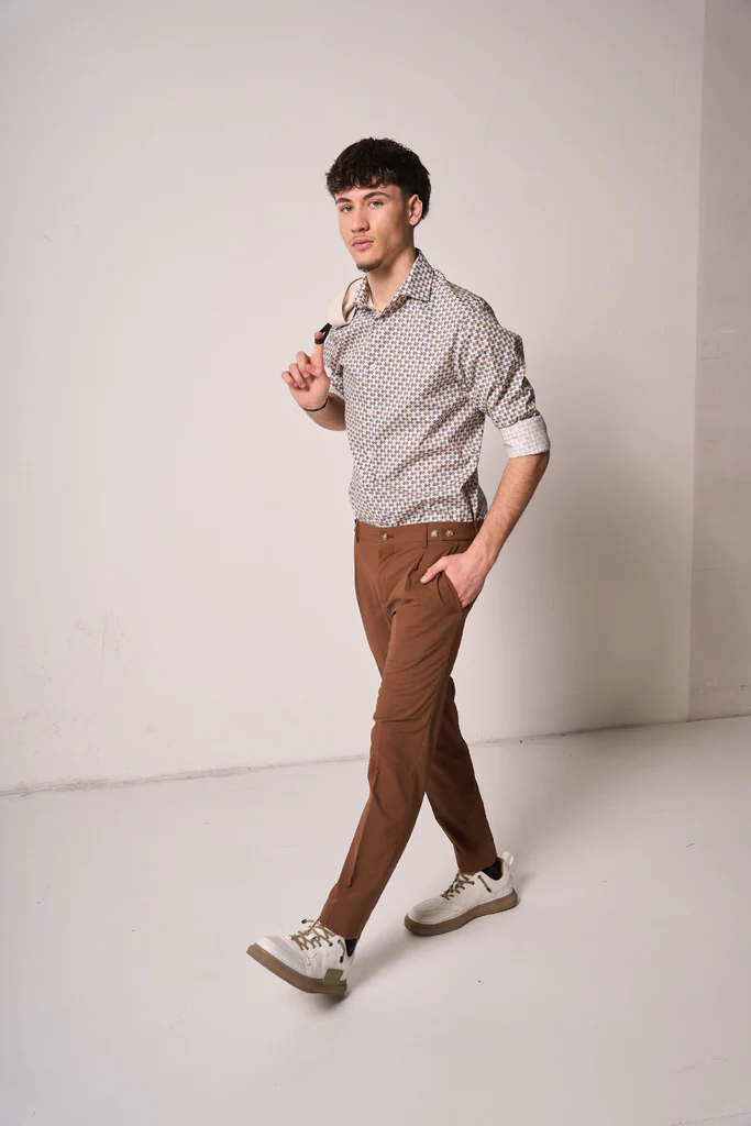 Camicia uomo dal carattere moderno e raffinato, realizzata in tessuto leggero e piacevole al tatto. La fantasia micro geometrica dona personalitร al capo senza rinunciare allโeleganza, mentre la vestibilitร slim fit valorizza la silhouette.Il colletto classico e i risvolti a contrasto sulle maniche aggiungono un dettaglio ricercato, perfetto per look casual chic o abbinamenti piรน formali con pantaloni sartoriali.