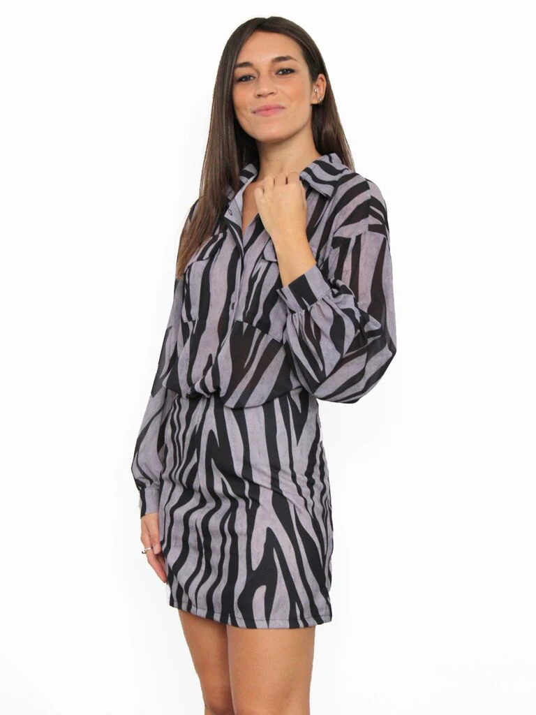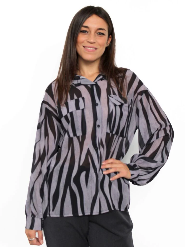 DESCRIZIONECamicia con fantasia zebrata, tasche applicate davanti, manica ampia con polsinoComposizione: georgette, poliestereCodice prodotto: 248476
