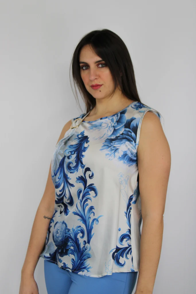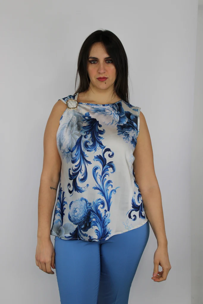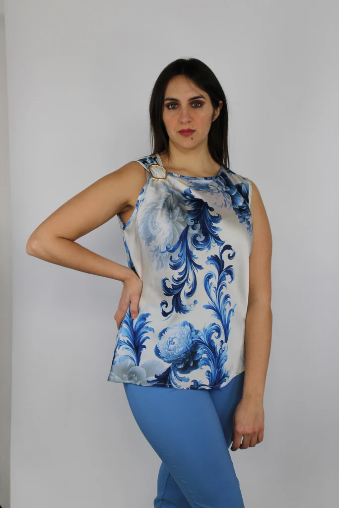 Top senza maniche in morbido raso lucido con elegante stampa barocca nei toni del blu e del bianco. Dettaglio di spilla dorata sulla spalla sinistra che aggiunge un tocco sofisticato. Perfetta per look estivi raffinati o outfit da sera con un tocco glamour.Composizione: 100% poliestere