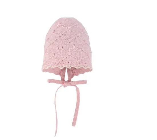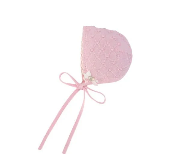 cuffietta a maglia per neonata con motivo a rombi e pom-pom. Dispone di un laccetto per una maggiore comoditร e regolazione. Fiocco con placca madreperla