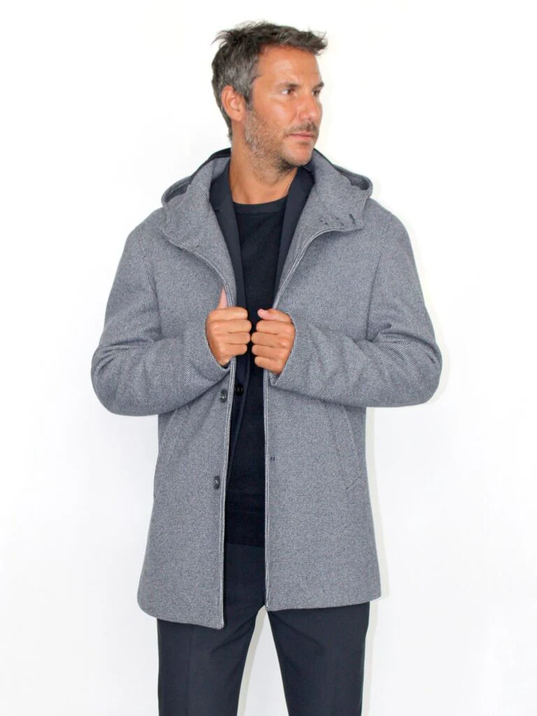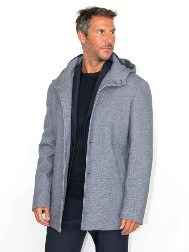 Cappotto con chiusura 3 bottoni, cappuccio, tasche oblique a listino. Interno mezzo foderato