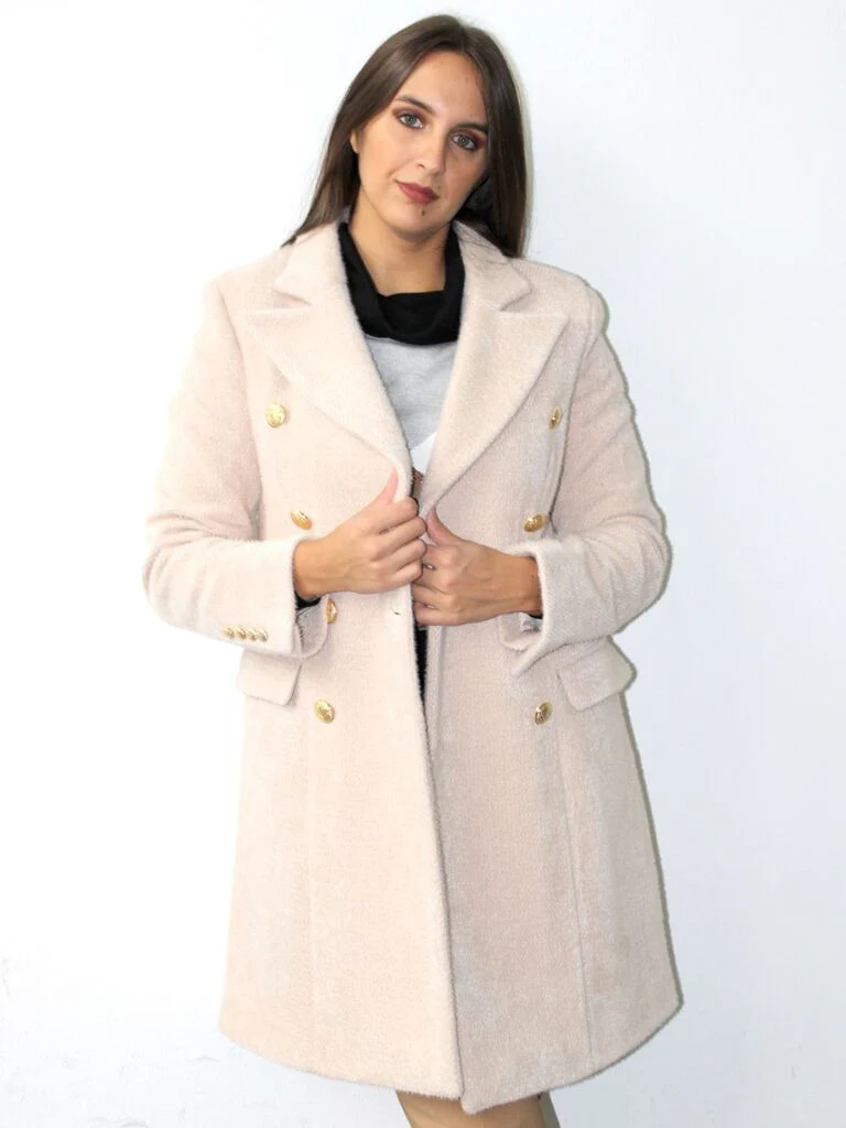 Cappotto doppiopetto, pelosino in lurex con tasche a pattina, bottoni gioiello dorati e bottoncini sui polsi.