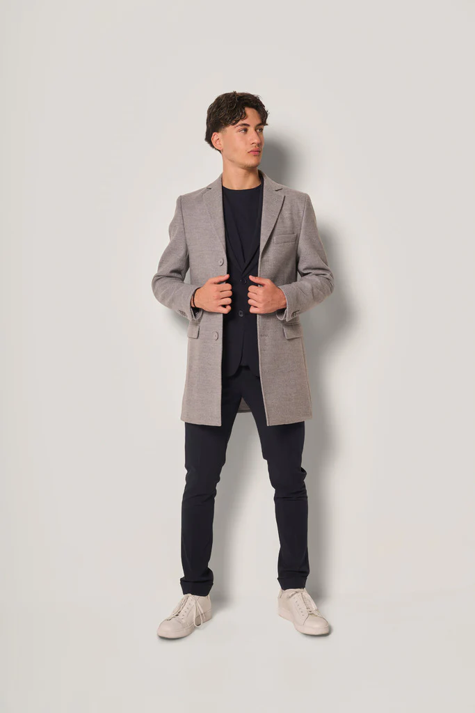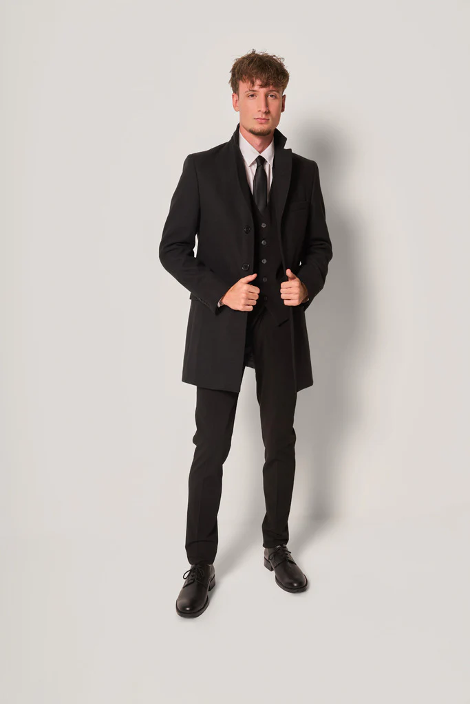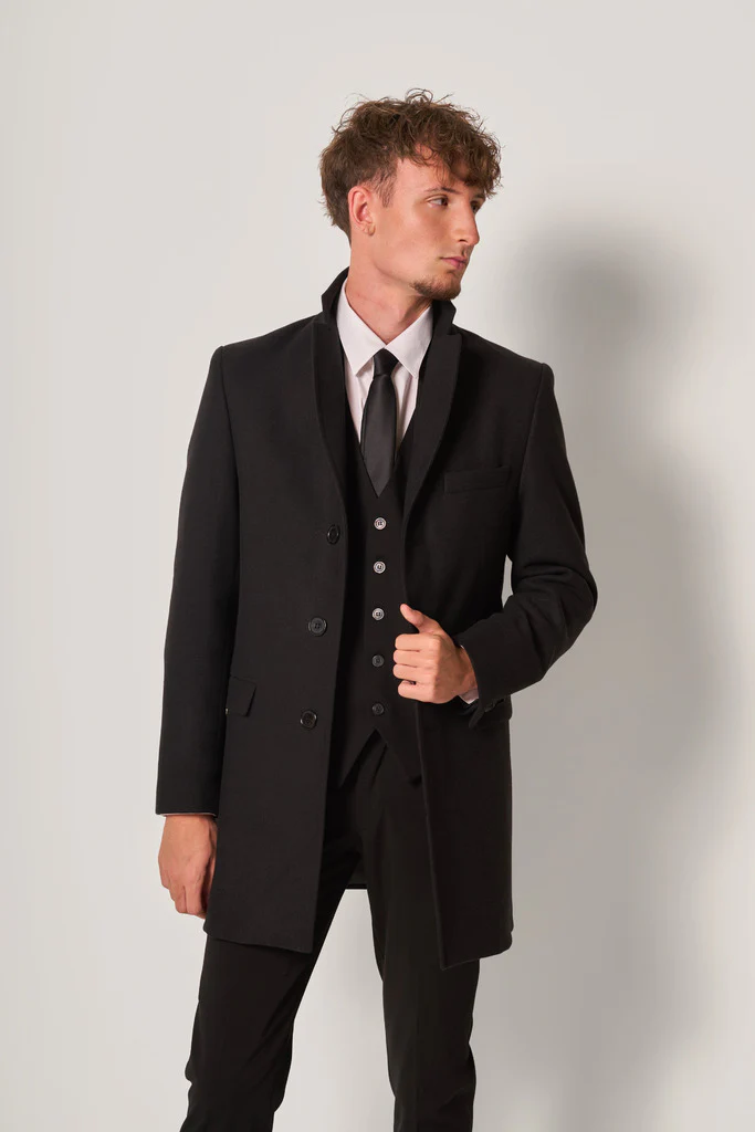 Cappotto da uomo dal taglio classico e raffinato. Il modello presenta revers classici, chiusura a due bottoni, tasche con patta e una linea slim ed essenziale che valorizza la silhouette.