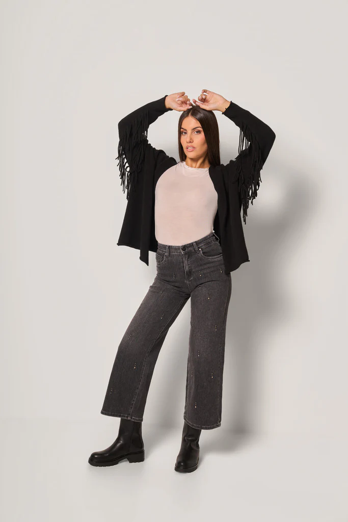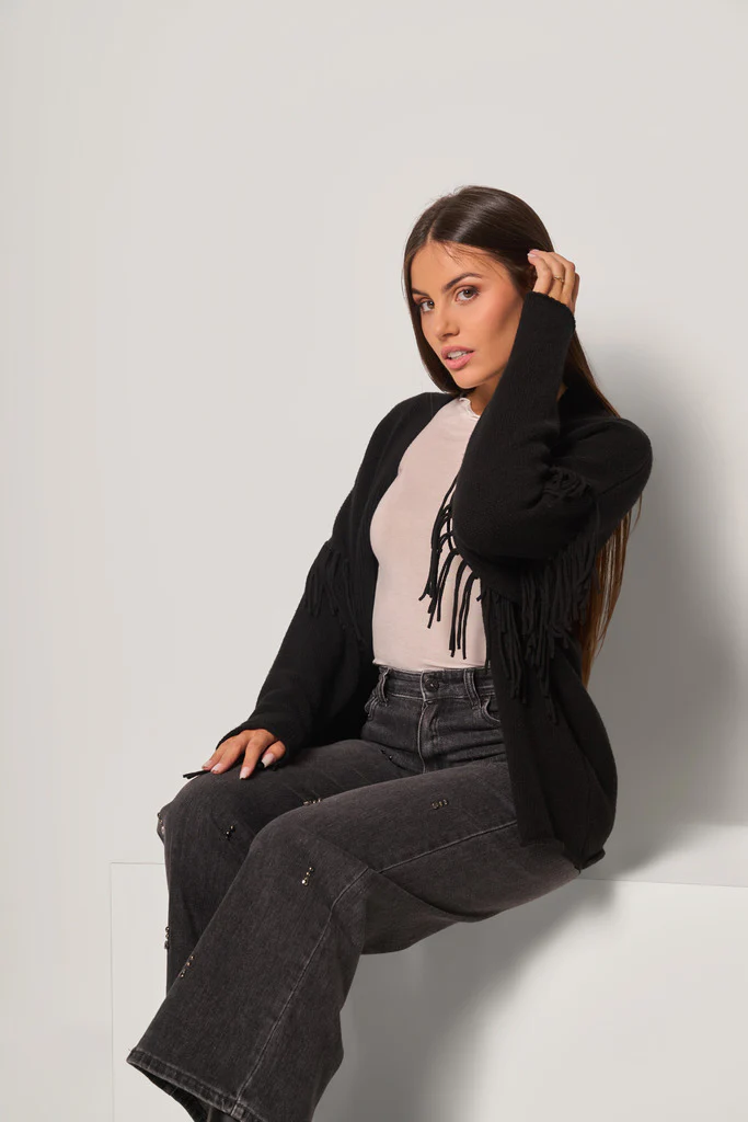 Cardigan in maglia leggera con maniche decorate da frange lunghe per un effetto grintoso e boho-chic. Il modello presenta una vestibilitร morbida e aperta, perfetta da sovrapporre a t-shirt, camicie o top per un look casual ma di carattere.