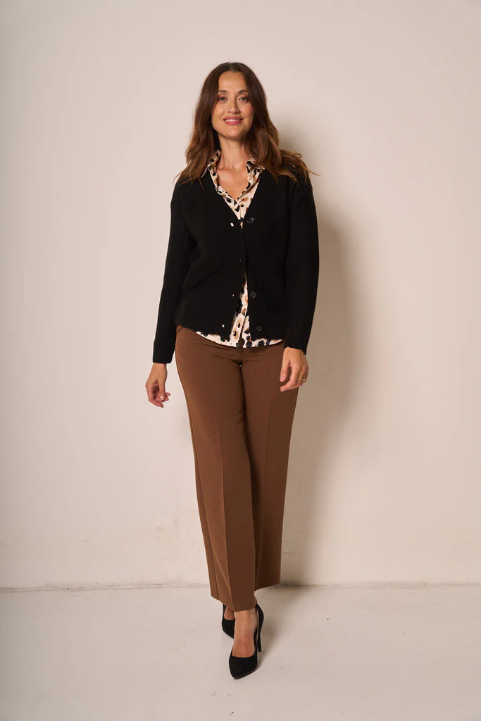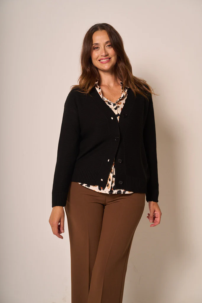 Cardigan dal design classico e versatile, realizzato in morbida maglia a costine. Il modello presenta scollo a V, chiusura frontale con bottoni tono su tono e finiture a costine su polsini e fondo.