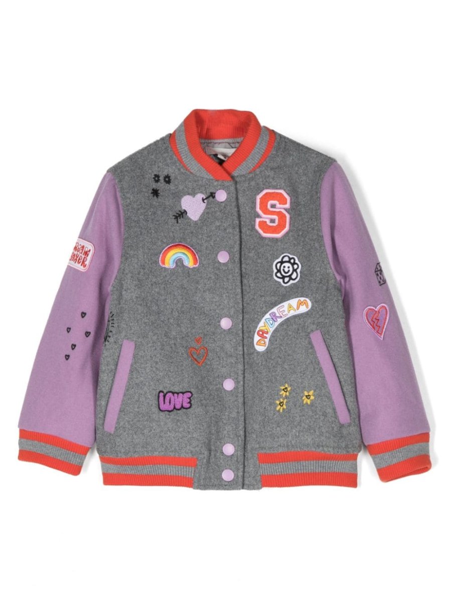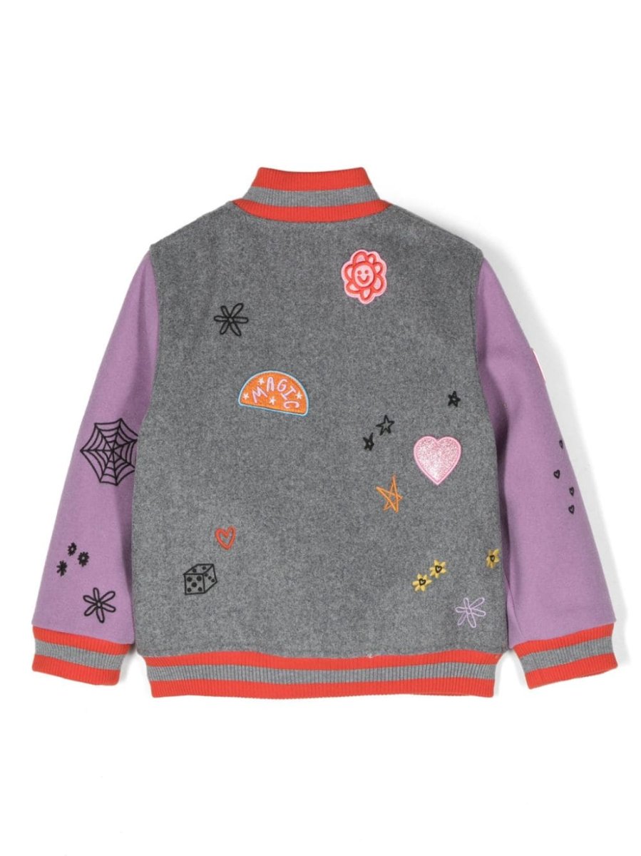 College Stella McCartney grigio, lilla, dettaglio con applicazione, dettaglio a coste, design color-block, colletto rialzato, chiusura frontale con bottoni, due tasche diagonali laterali e maniche lunghe.