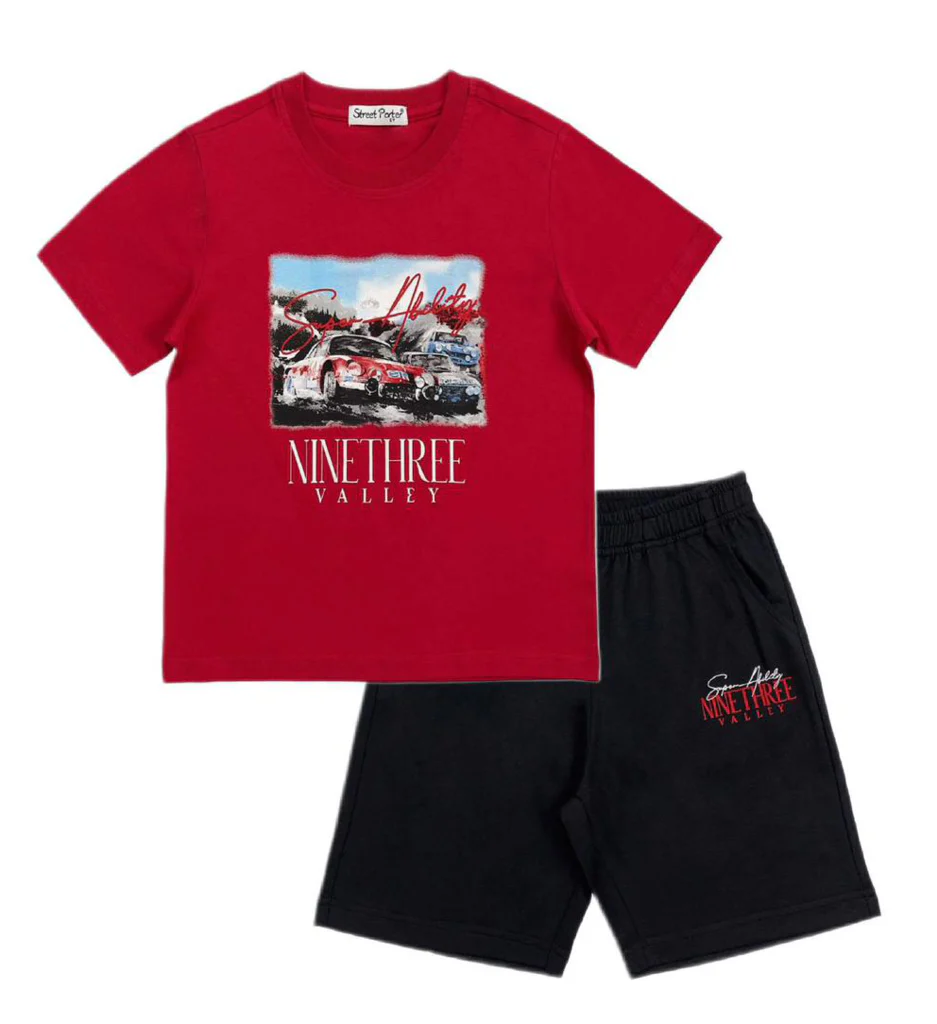 Completino da bambino baby, in diverse colorazioni, con stampa centrale. T-shirt a maniche corte e pantaloncino comodi.