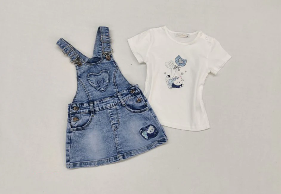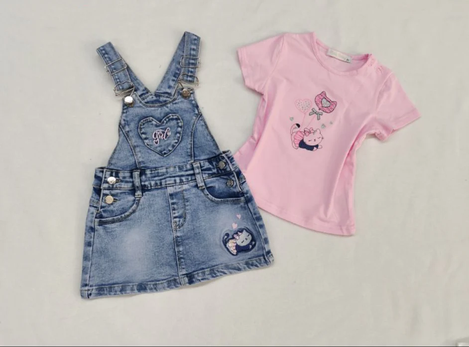 Completo da bambina 2 pezzi. T-shirt girocollo con stampa frontale al centro con gattino. Salopette con ricami e cuore in rilievo al centro.