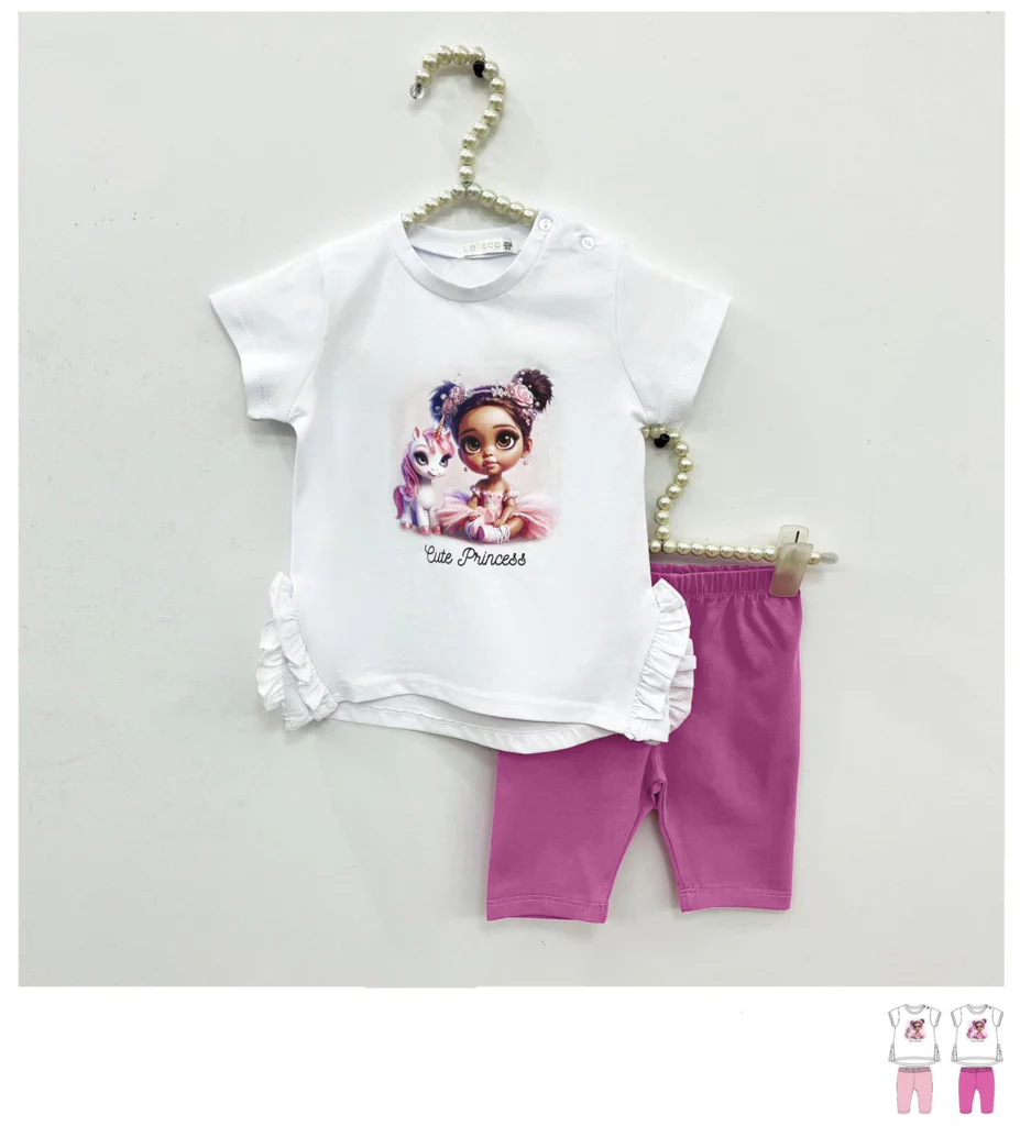 Completino 2 pezzi da bambina. Maglietta con stampa frontale “cute princess” al centro. Bottoni sulla spalla e volant al fondo. Pantaloncino leggins elasticizzato.