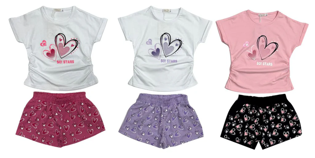 Completo da bambina 2 pezzi. T-shirt girocollo con stampa frontale al centro cuoricino. Pantaloncino con elastico in vita e stampe su tutto il pantaloncino.