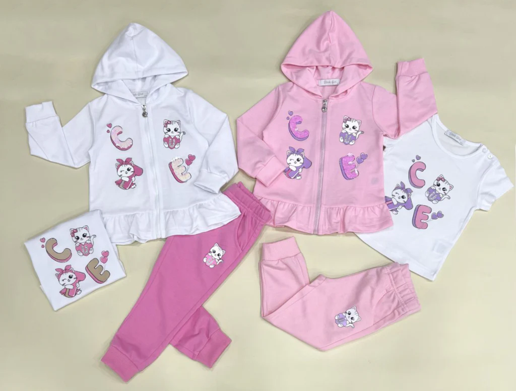 Completino da bambina 3 pezzi. T-shirt con stampa frontale al centro di gattini. Felpa con cappuccio, stampo frontale, zip di chiusura, elastico ai polsi e volant al fondo. Pantalone con elastico in vita e alle caviglie, piccola stampa laterale.