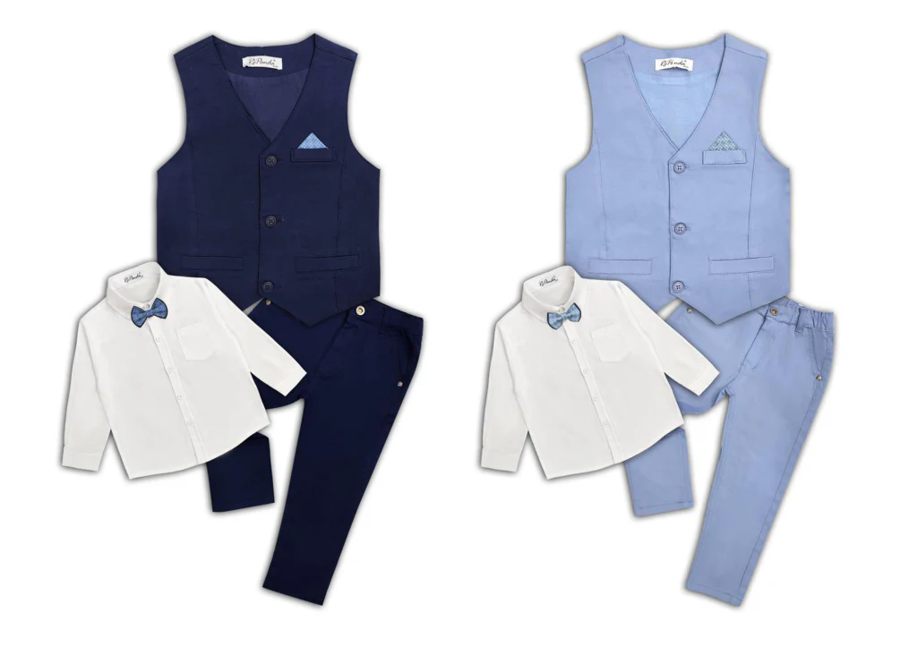 Completo da bambino 3 pezzi. Camicia con papillon con fantasia e taschino. Gilet 3 bottoni con pochette da taschino. Pantaloni regular fit con 2 tasche. Disponibile in due colori.