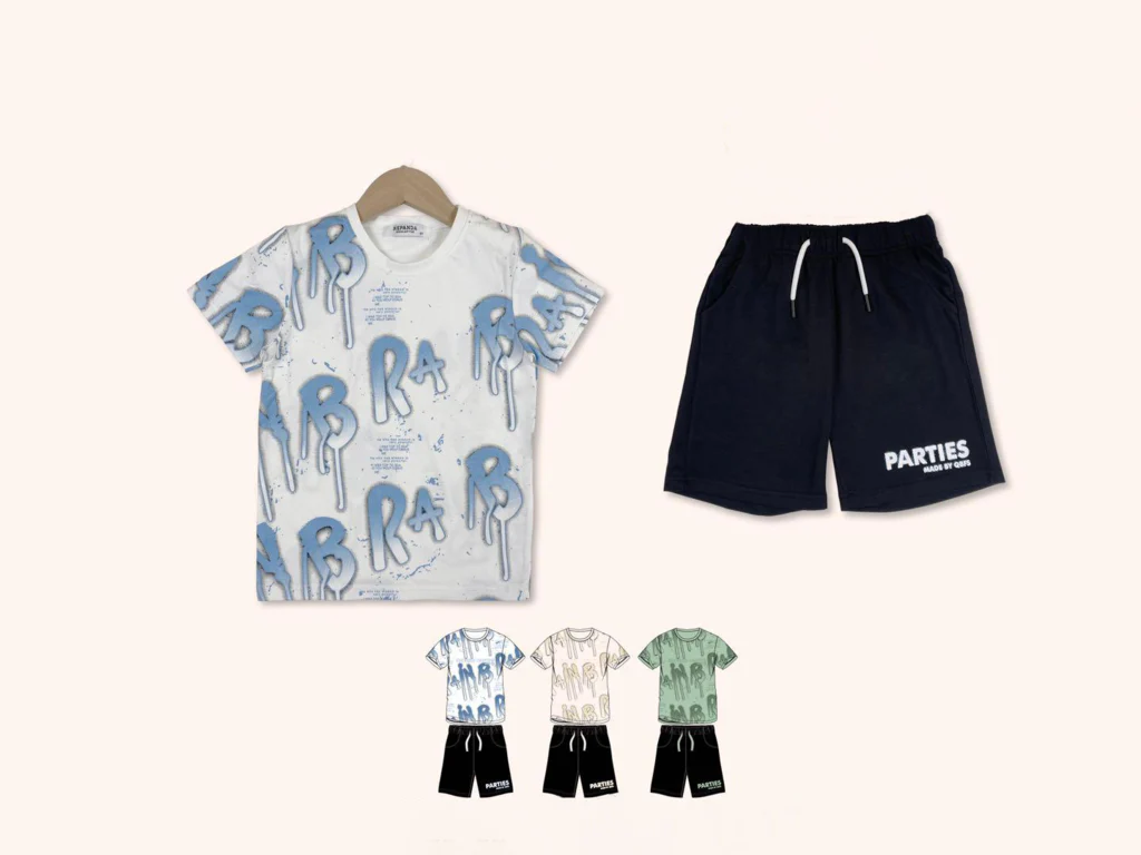 Completo da bambino estivo 2 pezzi. T-shirt girocollo con scritta. Pantaloncino comodo con elastico e lacci in vita, 2 tasche, e scritta sulla gamba sinistra. Disponibile in diversi colori.
