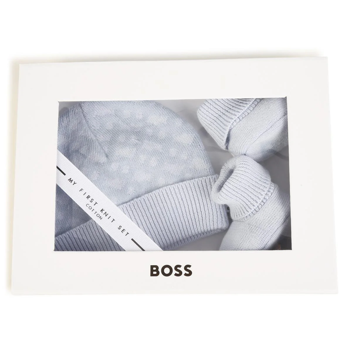 Questo completo BOSS prevede cappellino e scarpette lavorate a maglia in puro cotone. Il berrettino รจ ornato di monogramma integrale in jacquard e risvolto a coste. Entrambi gli articoli vengono venduti in una confezione regalo.