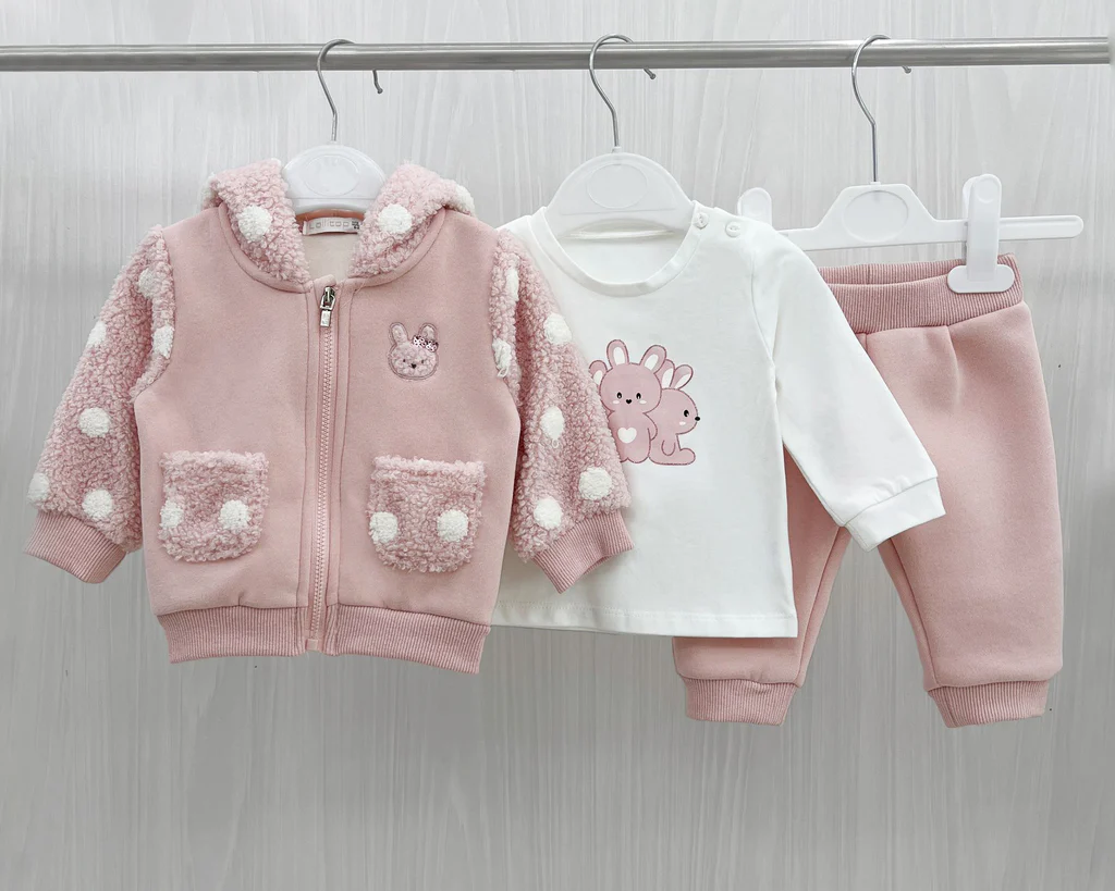 Completo da neonata composto da felpa con cappuccio con maniche e tasche in tessuto teddy a pois, t-shirt bianca a maniche lunghe con dolce stampa coniglietti e pantaloni rosa con polsino alla caviglia. Un outfit pratico e confortevole, perfetto per un look tenero e alla moda.