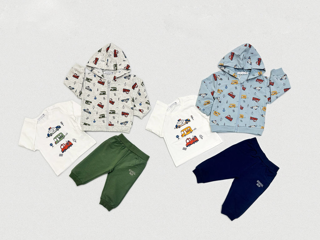 Completo pratico e colorato composto da tre pezzi: maglietta a maniche lunghe con stampa macchinine, felpa con cappuccio e zip con fantasia all-over di veicoli, e pantaloni in felpa con vita elastica e fondo gamba con polsino. Un set comodo e divertente, ideale per il tempo libero e le giornate di gioco.